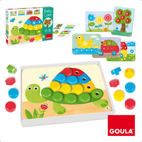 Das Kind lernt die Farben kennen und diese dem richtigen Platz zuzuordnen. Dazu werden die grossen Holzknöpfe in das richtige Loch gesteckt und die Bilder vervollständigt.